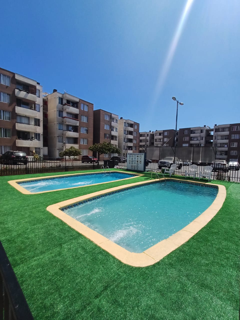 El Condominio cuenta con conserje 24/7 , piscina, juegos para niños, quincho.